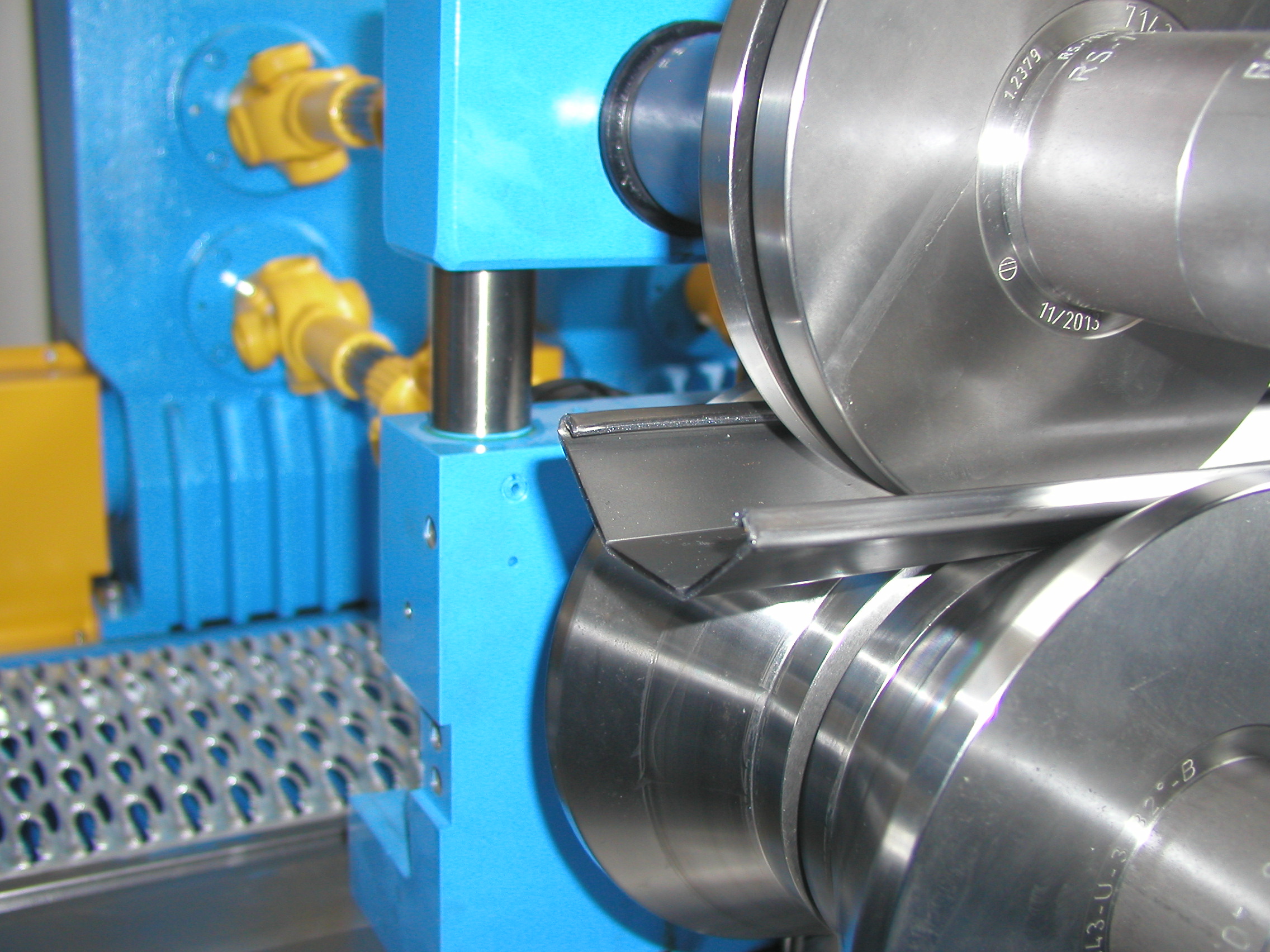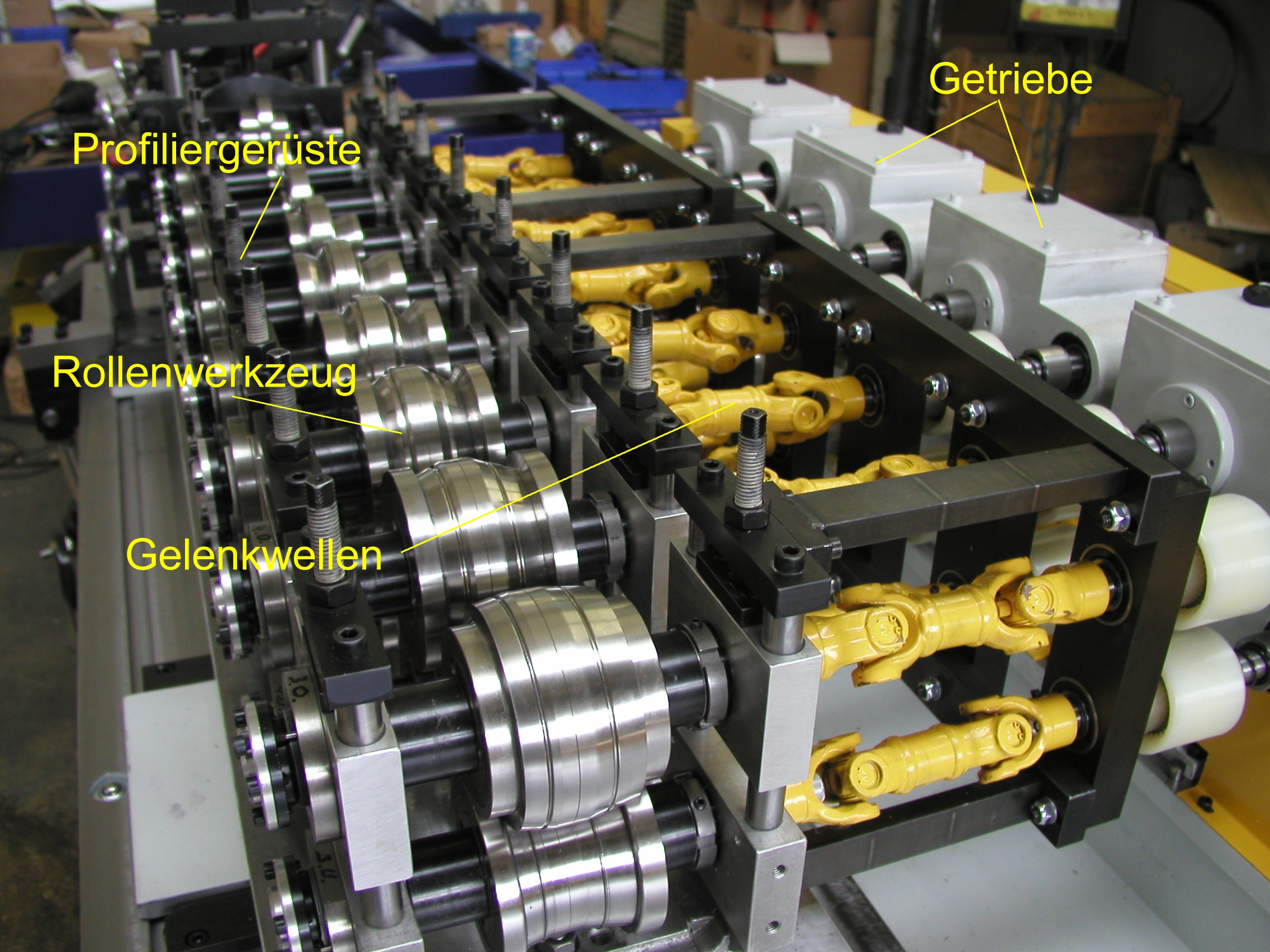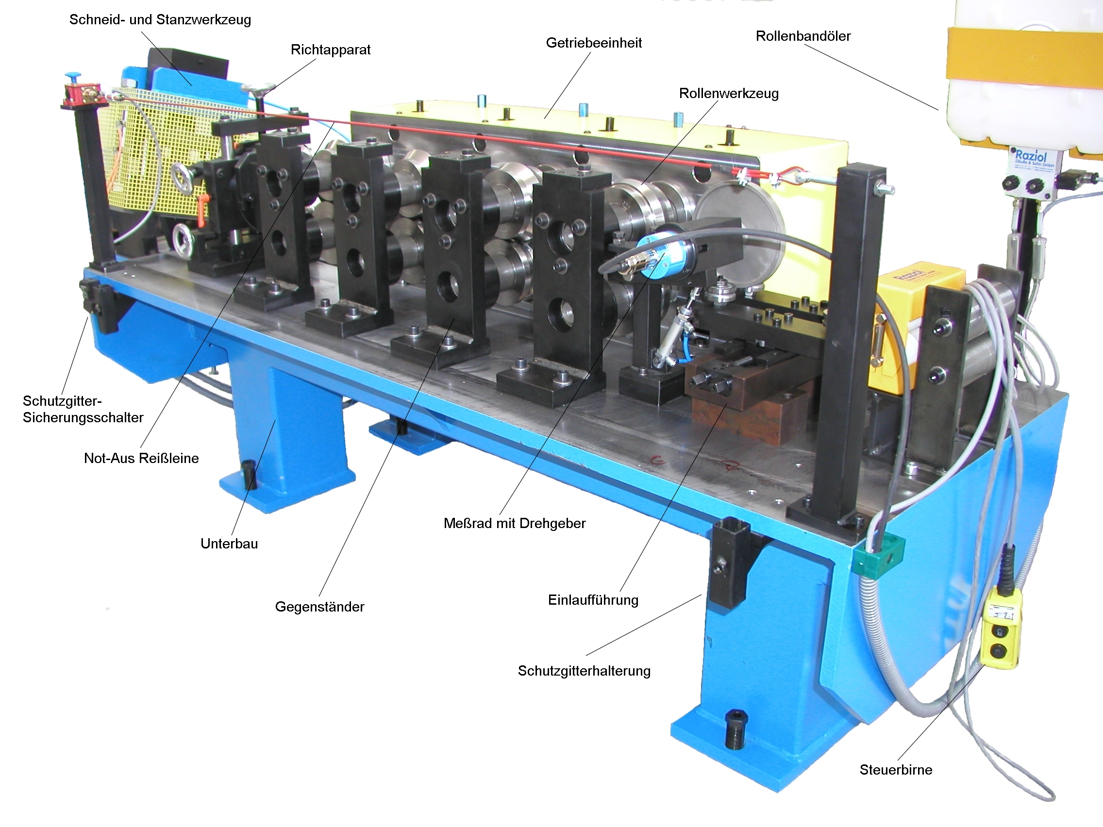 Profilieranlage PE 40 mit 4 Umformstationen mit Einlaufführung, Messrad, Rollenbandöler und Trennwerkzeug -