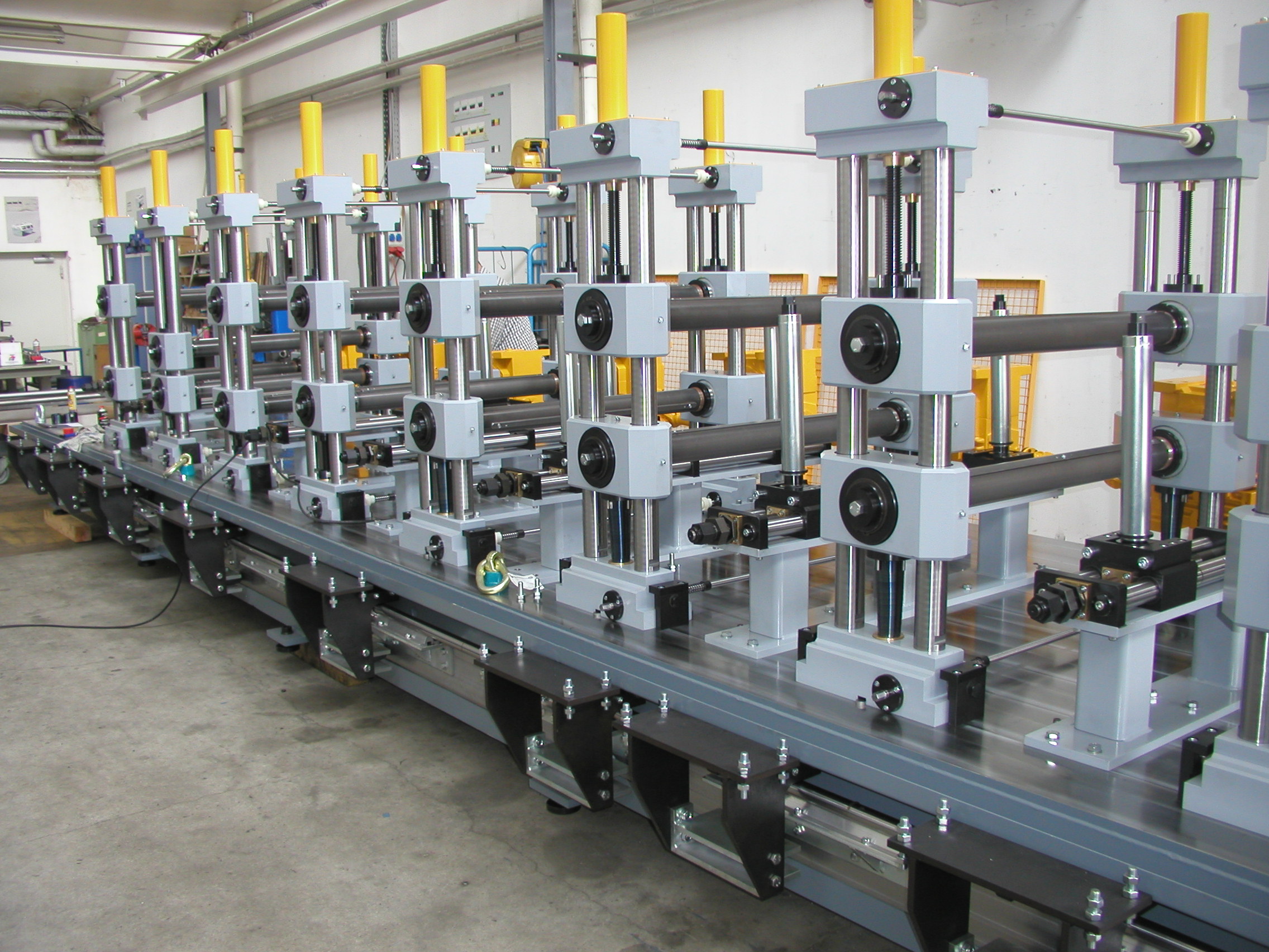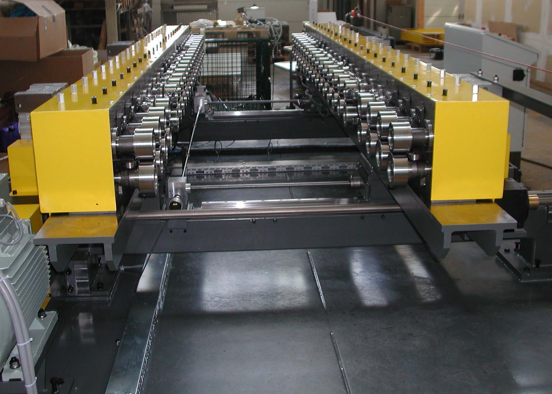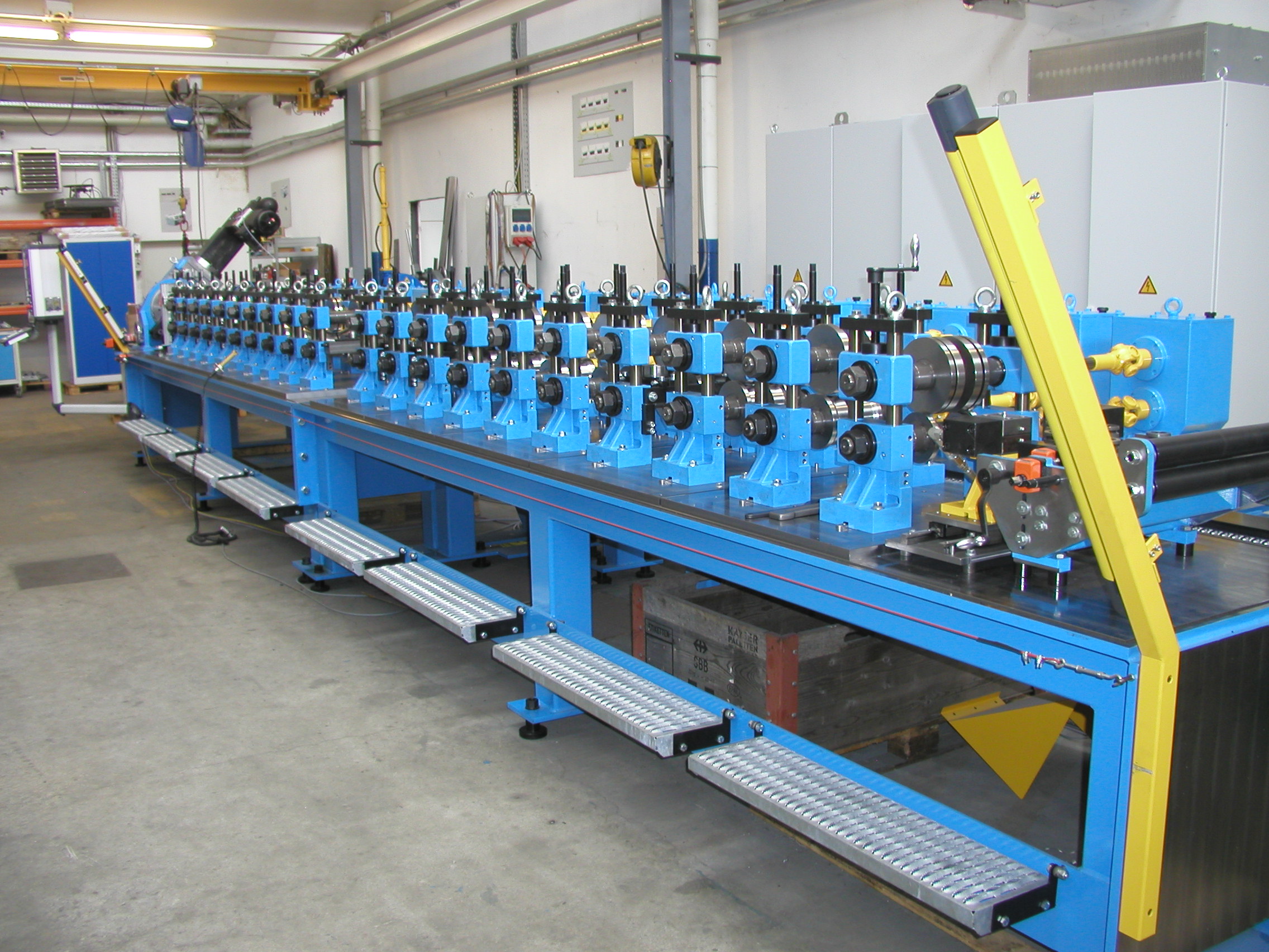 Profilieranlage PE 40 mit 4 Umformstationen mit Einlaufführung, Messrad, Rollenbandöler und Trennwerkzeug -